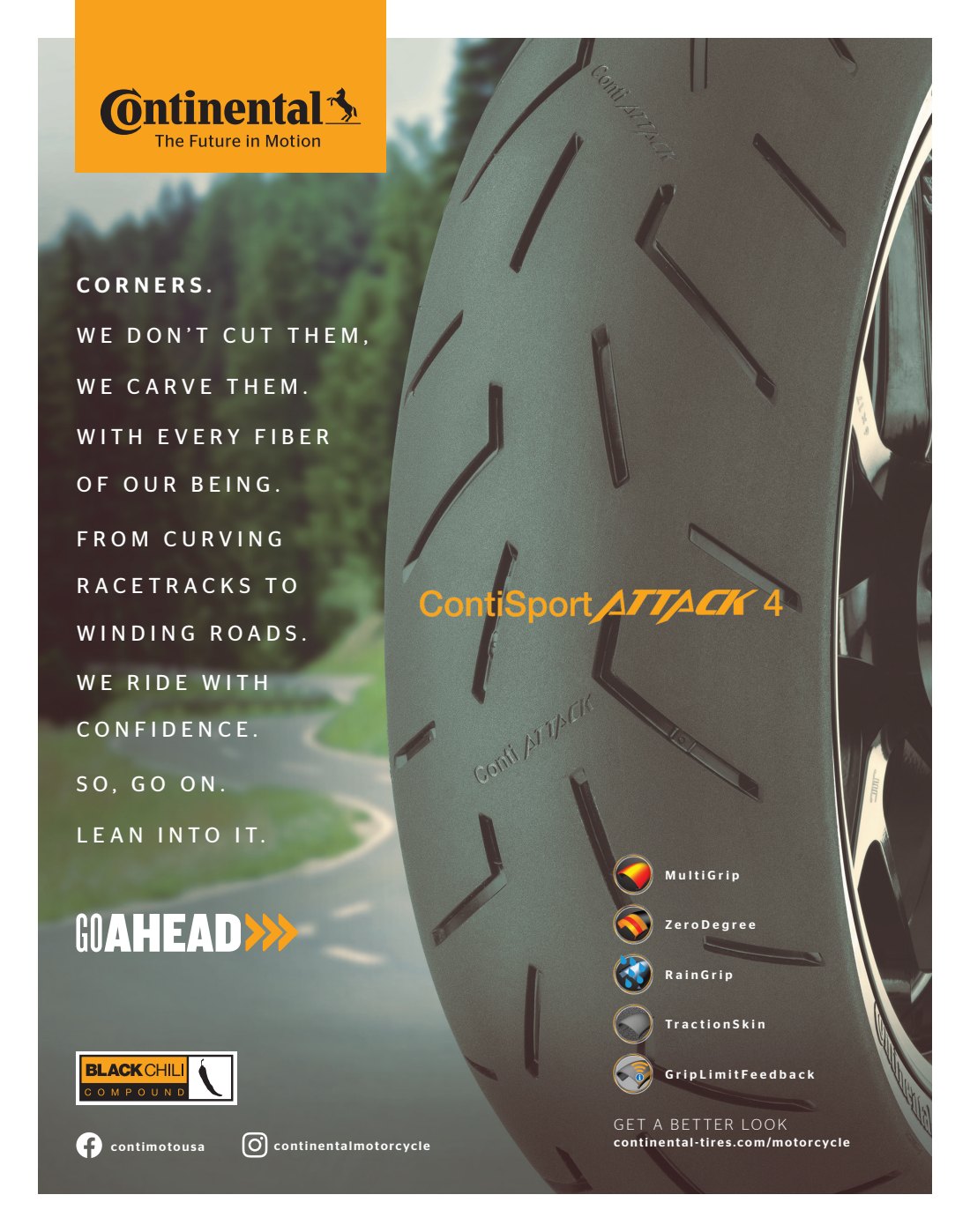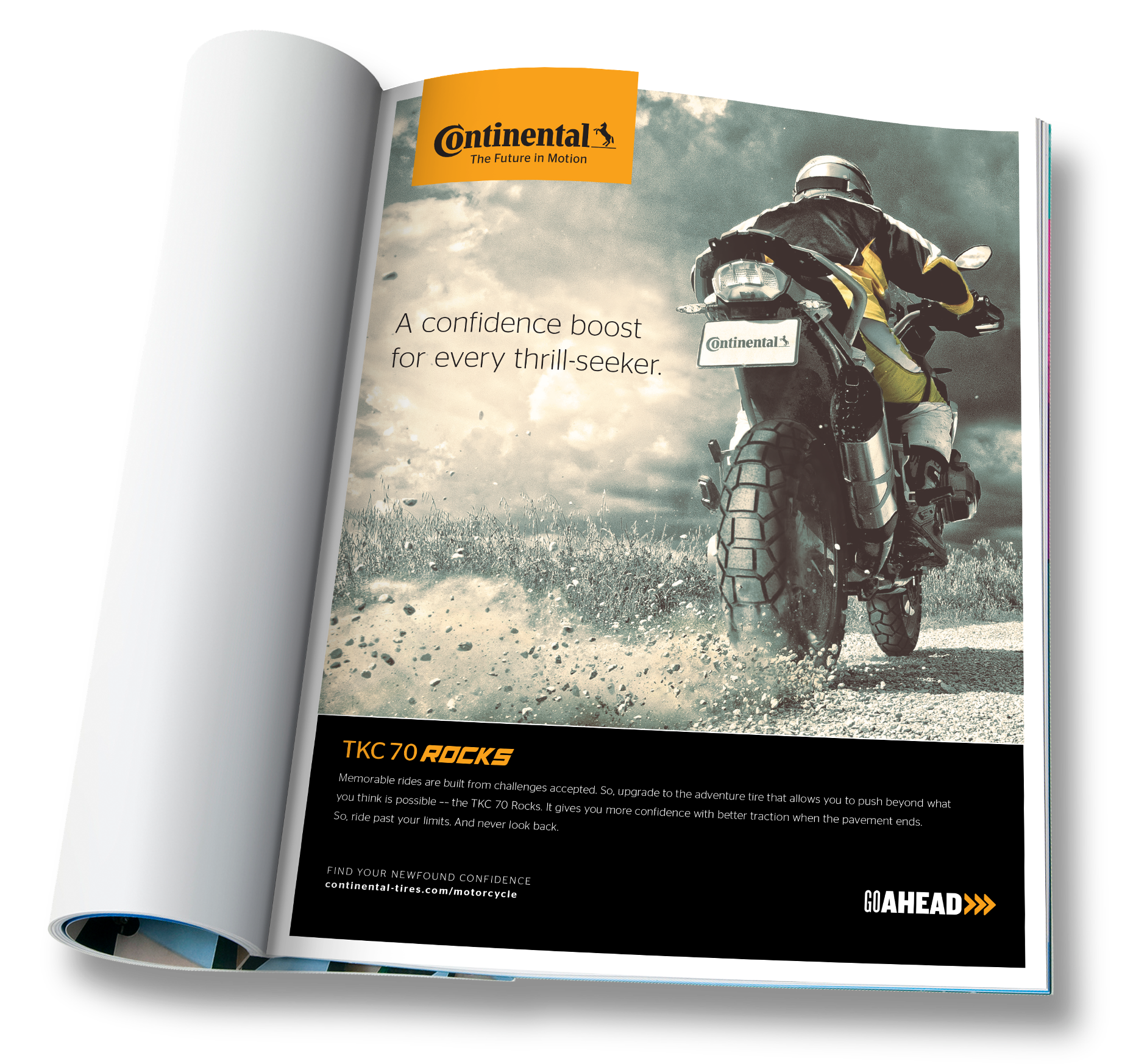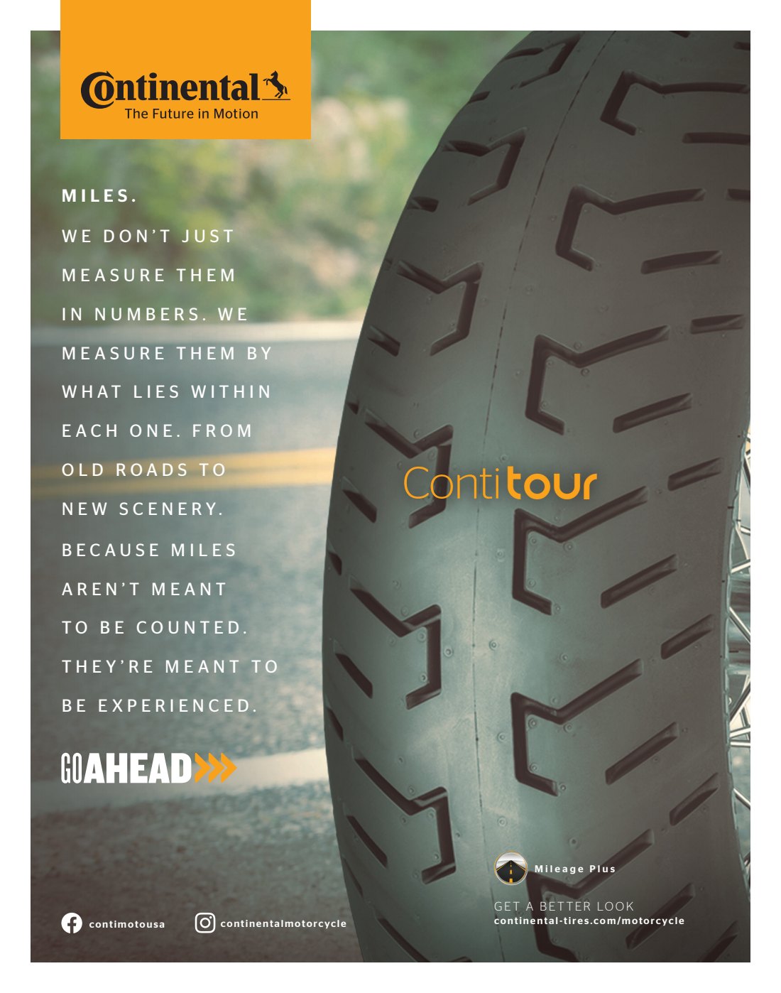 Below is a series of print ads, social ads and a landing page I wrote to compliment Continental’s “Go Ahead” campaign for its motorcycle tire line.